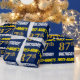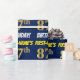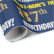 Este diseño de papel envolvente incluye un mensaje como "¡CUMPLEAÑOS 87 DE PRIMER NOMBRE!", en el que el "87" tiene un aspecto de color falso/imitación de color dorado, y con el nombre y el "CUMPLEAÑOS" en un tipo de letra divertido y audaz. El nombre se puede personalizar y el fondo es azul. El envolvimiento de papel como este podría ser usado cuando se le dan regalos de cumpleaños a alguien en celebración de sus ochenta y siete años. [~Z0000209]