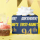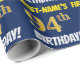 Este diseño de papel envolvente incluye un mensaje como "¡CUMPLEAÑOS 94 DE PRIMER NOMBRE!", en el que el "94º" tiene un aspecto de color falso/imitación de color dorado, y con el nombre y el "CUMPLEAÑOS" en un tipo de letra divertido y audaz. El nombre se puede personalizar y el fondo es azul. El envolvimiento de papel como este podría ser usado cuando se le dan regalos de cumpleaños a alguien en celebración de su cuarto cumpleaños. [~Z0000209]