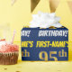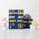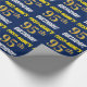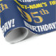 Este diseño de papel envolvente incluye un mensaje como "¡CUMPLEAÑOS 95 DE PRIMER NOMBRE!", en el que el "95" tiene un aspecto de color falso/imitación de color dorado, y con el nombre y el "CUMPLEAÑOS" en un tipo de letra divertido y audaz. El nombre se puede personalizar y el fondo es azul. El envolvimiento de papel como este podría ser usado cuando se le dan regalos de cumpleaños a alguien en celebración de sus noventa y cinco años. [~Z0000209]