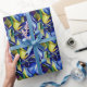 con diseños originales de acuarelas originales de flores de iris azul brillante y detalladas sobre fondo verde de Sacha Grossel. Este detallado diseño artístico de inspiración botánica muestra un diseño macro floral de foco cerrado en colores frescos de azul, verde con resaltes amarillos.