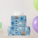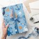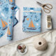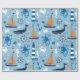 El diseño de temática oceánica y náutica incluye ballenas, veleros naranjas, pulpo, cangrejos, caballitos de mar, ruedas de barcos, anclas, faros y más sobre un fondo azul bonito.