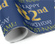 Este diseño de papel envolvente presenta un mensaje como "FELIZ 82º CUMPLEAÑOS", con el "82º" con una apariencia de oro falsa/imitación. También tiene un nombre personalizado y un fondo de color azul. Tal vez podría ser usado cuando se le dan regalos para el cumpleaños ochenta y dos de alguien. [~Z0000135]