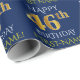 Este diseño de papel envolvente presenta un mensaje como "FELIZ CUMPLEAÑOS 46", con el "46" con una apariencia de oro falsa/imitación. También incluye un nombre que se puede personalizar y un fondo de color azul. Tal vez podría ser usado cuando se envuelven regalos para el cumpleaños cuarenta y seis de alguien. [~Z0000135]