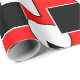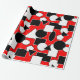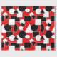 Este papel de envoltura tiene un diseño Bauhaus de triángulos, círculos, rectángulos y pentagones en blanco y negro sobre un campo de rojo.