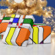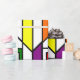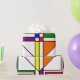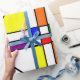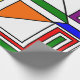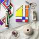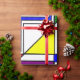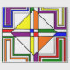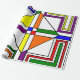 Este papel de envolvimiento tiene un diseño Bauhaus de líneas, triángulos, diamantes y cuadrados que hacen un aspecto de vidrio manchado en colores primarios y secundarios.
