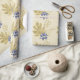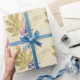 Un bonito papel de regalo de bayas azules y hojas doradas sobre un papel de textura áspera de fondo amarillo pálido