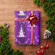 Este papel de envolvimiento de Navidades morados y blancos presenta un patrón moderno de árboles blancos de Navidad, con las palabras 'Be Merry' esparcidas sobre un fondo violeta brillante y colorido.