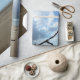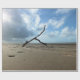 A photographic design of a beach, sky and a branch.