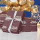 Un fondo café pardo mudo, texto de color crema. Feliz Navidad se escribe con un tipo de letra retro de los años 70. Personaliza y agrega tu apellido.