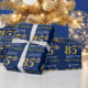 Este diseño de papel envolvente presenta un mensaje como "FELIZ 85º CUMPLEAÑOS", con el "85º" con una apariencia de oro falsa/imitación. También tiene un nombre personalizado y un fondo de color azul. Tal vez podría ser usado cuando se le dan regalos para el cumpleaños ochenta y cinco de alguien. [~Z0000135]