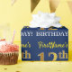 Este diseño de papel envolvente incluye un mensaje como "¡El duodécimo cumpleaños de FirstName!", y el "duodécimo" tiene un aspecto de color falso/imitación dorado. El nombre se puede personalizar y el fondo es azul. Tal vez podría ser usado cuando se envuelven regalos para el duodécimo cumpleaños de alguien. [~Z0000181]