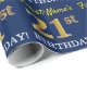 Este diseño de papel envolvente incluye un mensaje como "¡El vigésimo primer cumpleaños!", y el "21º" tiene un aspecto de color falso/imitación dorado. El nombre se puede personalizar y el fondo es azul. Tal vez podría ser usado cuando se envuelven regalos para el 21 cumpleaños de alguien. [~Z0000181]