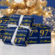 Este diseño de papel envolvente incluye un mensaje como "¡El cumpleaños 97 del nombre de pila!", mientras que el "97" tiene un aspecto de color falso/imitación dorado. El nombre se puede personalizar y el fondo es azul. Tal vez podría ser usado cuando se envuelven regalos para el cumpleaños noventa y siete de alguien. [~Z0000181]