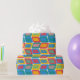 Este papel envolvente tiene un diseño moderno de mediados de siglo de colores brillantes que hacen rectángulos redondeados con otros rectángulos dentro formados por una colección de líneas.