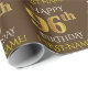 Este diseño de papel envolvente presenta un mensaje como "FELIZ 96º CUMPLEAÑOS", con el "96º" con una apariencia de oro falsa/imitación. También tiene un nombre que se puede personalizar y un fondo de color marrón. Tal vez podría usarse cuando se envuelven regalos para el cumpleaños noventa y seis de alguien. [~Z0000133]