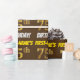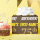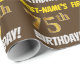 Este diseño de papel envolvente incluye un mensaje como "¡CUMPLEAÑOS 75 DE PRIMER NOMBRE!", mientras que el "75" tiene un aspecto de color falso/imitación de color dorado, y con el nombre y el "CUMPLEAÑOS" en un tipo de letra divertido y audaz. El nombre se puede personalizar y el fondo es marrón. El papel envuelto como este podría ser usado cuando se le dan regalos de cumpleaños a alguien en celebración de sus setenta y cinco años. [~Z0000211]