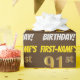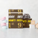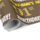 Este diseño de papel envolvente incluye un mensaje como "¡CUMPLEAÑOS 91 DE PRIMER NOMBRE!", mientras que el "91" tiene un aspecto de color falso/imitación de color dorado, y con el nombre y el "CUMPLEAÑOS" en un tipo de letra divertido y audaz. El nombre se puede personalizar y el fondo es marrón de colores. El envolvimiento de papel como este podría ser usado cuando se le dan regalos de cumpleaños a alguien en celebración de su cumpleaños noventa. [~Z0000211]