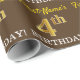 Este diseño de papel envolvente incluye un mensaje como "¡El cuarto cumpleaños del primer nombre!", y el cuarto tiene un aspecto de color falso/imitación dorado. El nombre se puede personalizar y el fondo es marrón. Tal vez podría usarse cuando se envuelven regalos para el cuarto cumpleaños de alguien. [~Z0000180]