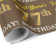 Este diseño de papel envolvente incluye un mensaje como "¡El CUMPLEAÑOS 77 del Nombre!", mientras que el "77" tiene un aspecto de color falso/imitación dorado. El nombre se puede personalizar y el fondo es marrón. Tal vez podría usarse cuando se envuelven regalos para el cumpleaños setenta y siete de alguien. [~Z0000180]