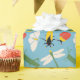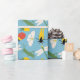 Envuelve sus regalos con bicho. Este papel de envoltura presenta ilustraciones de bichos en un estilo retro audaz y colorido con escarabajos, polillas, libélulas, cigarras y saltamontes en blanco, verde, amarillo, rojo y negro sobre un fondo azul claro.