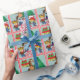 Caballo personalizado con regalos delante de un árbol de Navidad y una niña pequeña de vaquero sobre un caballo con bastón impreso y un pequeño vaquero con un títere de caballo en papel de regalo de vacaciones. El texto incluido dice "Feliz Navidad" Este diseño también está disponible en una versión más grande. Vea este diseño en otros artículos de vacaciones en el Rodeo Days Store.