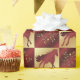 Una silueta de caballo de color vino con cuadrados de oro y vino y hojas de oro en las plazas de color vino. También hay una pequeña versión impresa de este papel de envoltura.