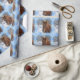 Una foto de un caballo de la castaña que se coloca en la nieve que mira a través de una frontera de copos de nieve azules.