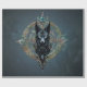 Los lobos negros se enarbolan con ojos azul penetrante, colocados sobre un fondo circular y ornamentado. El fondo es un diseño complejo de motivos dorados e iridiscentes, que se asemeja a un símbolo mágico. La piel del lobo se detalla con líneas y sombras intrincadas, dándole una presencia mística y poderosa.