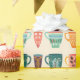 Se organizan en forma de repetición, con un fondo blanco, diferentes tazas coloridas de café y té con diferentes motivos florales y cardíacos. Cada copa muestra una combinación única de colores y diseños, creando una pantalla vibrante y simétrica.