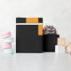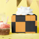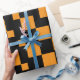 Una caja de regalo de vacaciones muy bien envuelta adornada con una proa roja vibrante, ambientada en un entorno festivo de ramas de pino verde, pinecones y adornos coloridos. El exclusivo papel de envoltura a cuadros negros y naranjas le da un toque moderno a esta escena tradicional de Navidades, perfecta para hacer regalos durante la temporada festiva.