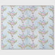 Papel envuelto con un fondo de color gris azul pastel. Encaramado en la parte superior hay un cráneo boho de animales de moda con un ramo de flores en la cabeza y pequeñas mariposas revoloteando por ahí.