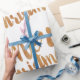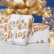 Papel de envolver en blanco y bronce con Feliz Navidad escrito en una fuente caligráfica. Nota: el bronce no es más que un bronce impreso.