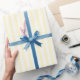 This wrapping paper features a clean and modern design with alternating yellow and white vertical stripes, creating a fresh and cheerful look. The minimalist aesthetic is perfect for adding a touch of elegance to any gift, making it suitable for various occasions such as birthdays or holidays. Its simple yet stylish pattern pairs well with natural twine or ribbon for an extra decorative touch, enhancing the overall presentation of your wrapped gifts.