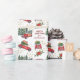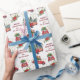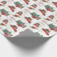 Este envolvimiento navideño de regalo de la festividad incluye imágenes de autos y camiones retro rojos que transportan árboles de Navidad recién cortados y paquetes de regalos envueltos de colores vivos. Un ramo de insettia y un rocío de estrellas doradas añaden un toque de brillo adicional al diseño. El texto de su personalizado está en rojo entre las imágenes. Diversión para todas las edades, con un toque de nostalgia.