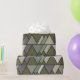Este papel envolvente tiene un diseño moderno de mediados de siglo de triángulos superpuestos que se ejecutan horizontalmente en colores de camo.