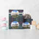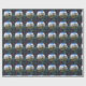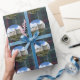 Un moderno tartán de Sutherland azul y verde forma el fondo de una hermosa foto del asiento del clan, el Castillo de Dunrobin, para crear un inolvidable papel de envoltura de aspecto vintage.
