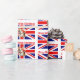 Un alegre corgi británico con Navidades de renos cortando en el aire con el fondo de la bandera británica. Texto "Feliz Navidad británico"