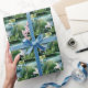 Una silla blanca de madera en un campo veraniego de césped alto y flores silvestres delicadas con una canasta blanca de mimbre llena de flores azules olvidadas-me-no
