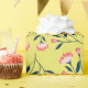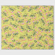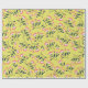 Patterned design with pink flowers and dark green leaves scattered on a bright yellow background. The floral motif is cheerful and lively.