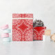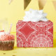 Esta mandala blanca se sienta sobre un fondo rojo brillante. El color es enérgico y cálido. Parte de la colección Hyil Mandala.