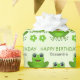 Este adorable diseño presenta una linda rana verde con el texto "Feliz cumpleaños". Personalizado con el nombre de tu hijo, hazlo un regalo único para la celebración de cumpleaños de tus hijos.