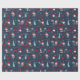 Add your family name and celebration date to wrapping paper with whimsical holiday design featuring Santa cupcakes, snowmen, gift boxes, string lights, and snowflakes on a dark blue background.