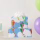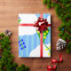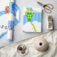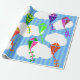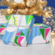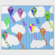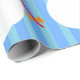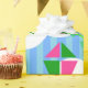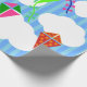 Este papel de envoltura tiene un diseño geométrico de cometas volando en las nubes de un cielo de rayas azules. Es muy colorido y festivo.