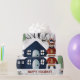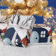 Ciervo de invierno, árboles y casa Felices fiestas Papel de regalo de Navidad que muestra un ciervo con ropa de invierno, árboles, una casa, adornos y regalos.
