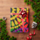 Este papel de envoltura tiene un diseño de historia negra de grandes círculos formados de formas de gotas de lluvia y círculos en rojo, amarillo, púrpura, verde y turquesa.