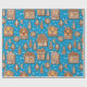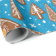Patrón vectorial dibujado a mano con varias casas de jengibre, abetos, copos de nieve y galletas en forma de luna creciente en azul con caída de nieve