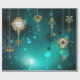 El oro, las llaves antiguas con engranajes y diales cuelgan de las cadenas de oro sobre un fondo verde luminoso.