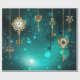 El oro, las llaves antiguas con engranajes y diales cuelgan de las cadenas de oro sobre un fondo verde luminoso.