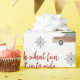 Navidades envolviendo papel con un patrón en vehículos de madera revestidos con un árbol de Navidad atado a la parte superior. El texto dice, "qué divertido es montar" el diseño también incluye copos de nieve.