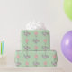 Papel envuelto con un caprichoso conejo blanco sosteniendo un gran globo rosado flotando en el aire. Un elegante cartel con un pequeño pájaro azul dice "Feliz cumpleaños. Se coloca sobre un fondo verde claro.